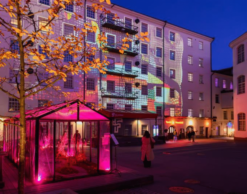 Finlaysonin alueen syksyssä nautitaan tunnelmallisista, maksuttomista valotapahtumista: kävijöitä viihdyttävät mm. Itäisenkadun ja tehtaanpiipun vaihtuva valaistus sekä suosittu
